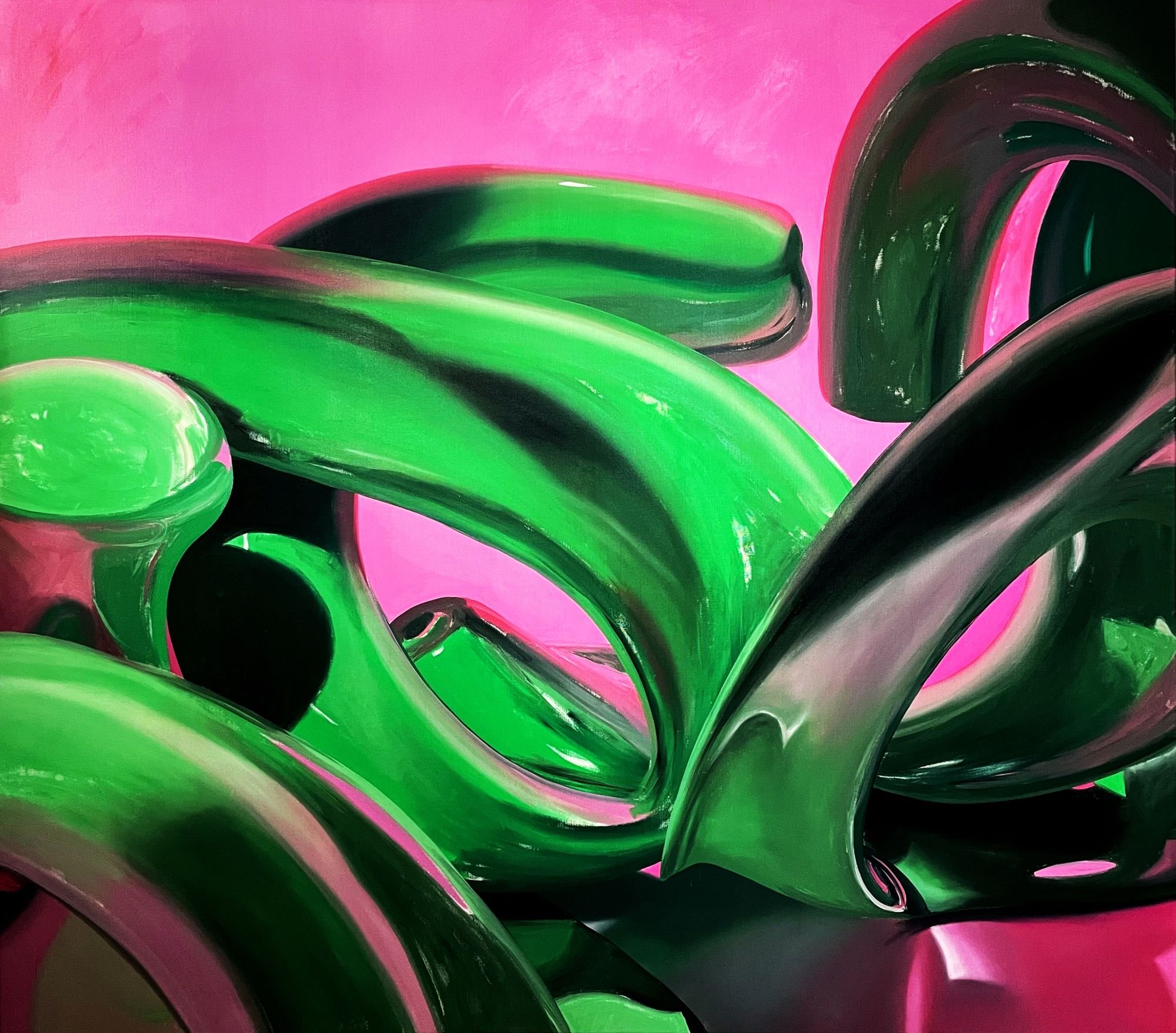 Das Formenrepertoire, welches in Ju Schnees Leinwänden und Skulpturen vorherrscht, nimmt den Betrachter mit in eine virtuell scheinende Welt, die sich aus einer Vielzahl an Formen, Materialitäten und Farben zusammensetzt.