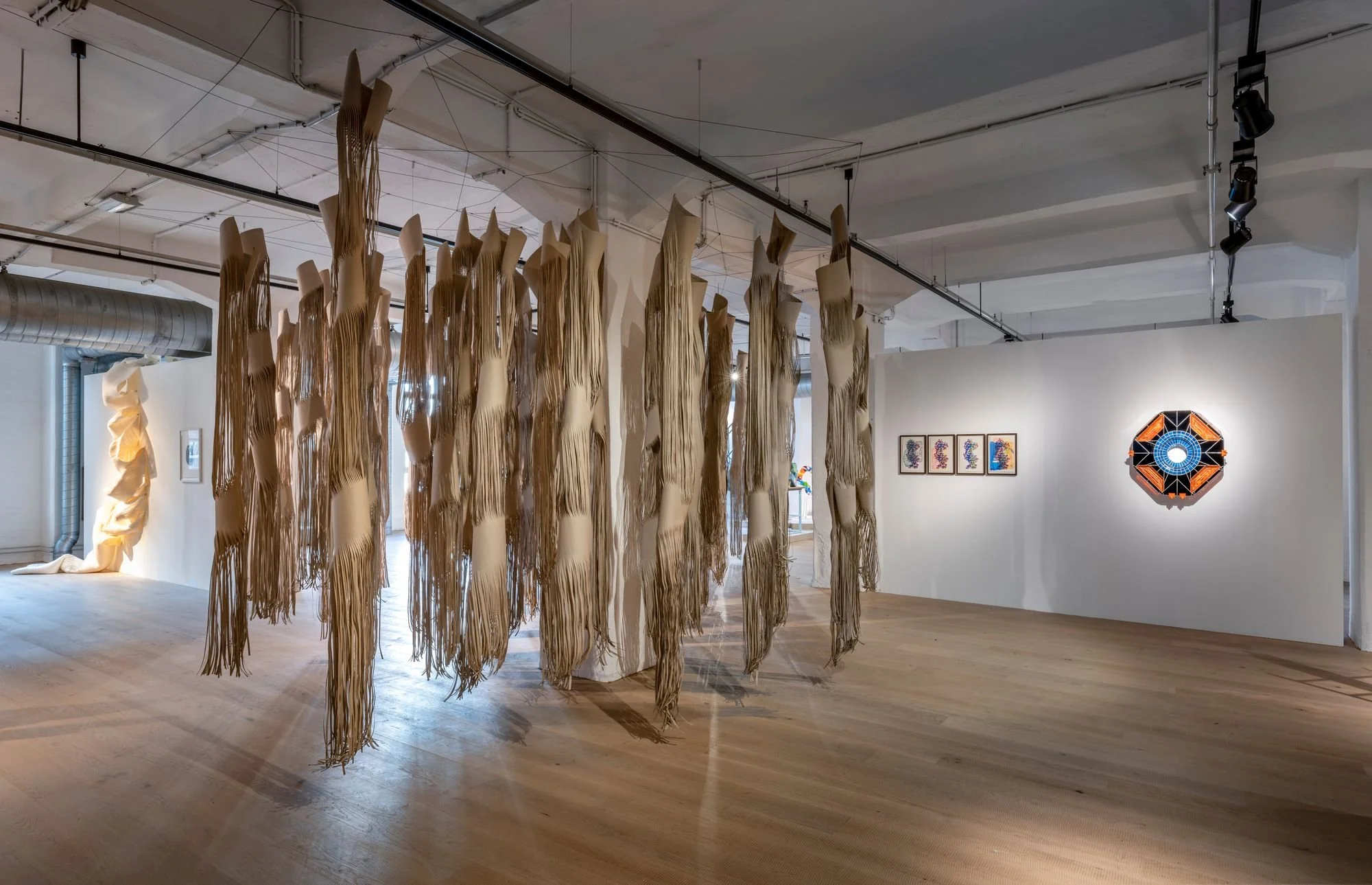 Die MeetFrida Art Foundation zeigt im November und Dezember ihre vorerst letzte Ausstellung im MeetFrida ArtSpace im stilwerk. Zwei Künstlerinnen zeigen Arbeiten zwischen körperhaften Papierskulpturen und psychedelisch-bunten Stahlformationen. Renata Palekcic versteht ihre Arbeiten auf und aus Papier selbst als „dreidimensionales Zeichnen“, um Raum einzunehmen und als skulpturale Auseinandersetzung mit Papier in Form von Objekten und Installationen. Mithilfe verletzender Schnitte an der Oberfläche ergeben sich dreidimensionale und vielschichtige Materialformungen, die das Medium Papier voluminös verformen und sie zu organischen Gebilden werden lassen. Die Objekte entwickeln sich in verschiedenen Variationen stetig weiter und können beinahe als ständiger „work in progress“ verstanden werden, in dem durch wiederkehrende Handlungen immer wieder auf neue Räume und Kontexte eingegangen wird. Dem Gegenüber stehen Janine Eggerts Arbeiten sowohl auf Papier als auch aus Stahl. Auch ihre Arbeiten verlassen ihre ursprüngliche Bedeutungsebene als Autofelge und werden zu Schmuckstücken, die als architektonischen Elemente eine bühnenartigen Fassade bilden. Sie fungieren sowohl in der Installation als auch als Bauteil am Auto selbst als ornamentales Element, wo sie unter anderem Attribute wie Härte, Kraft und Dynamik oder auch Reichtum und Glamour verkörpern. In der Installation wiederum werden die kantigen, dynamischen Alu-Felgen zu statischen Ornamenten: sie erinnern einerseits an Orte künstlerischer Produktion, die sich oft auch in der nähe industrieller Produktion wiederfinden, andererseits scheint ihre Dynamik und „Härte“ durch die Transformation in Material und Farbe abgeschwächt. Anne Simone Krüger, Kunsthistorikerin, führt auf der Vernissage am 17. November in die Ausstellung ein.